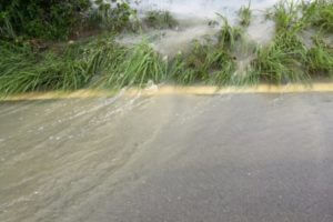 あの茶色い水が、満潮のときと重なって、あの信号機らへんにどーっと流れ込んだらしいのです。